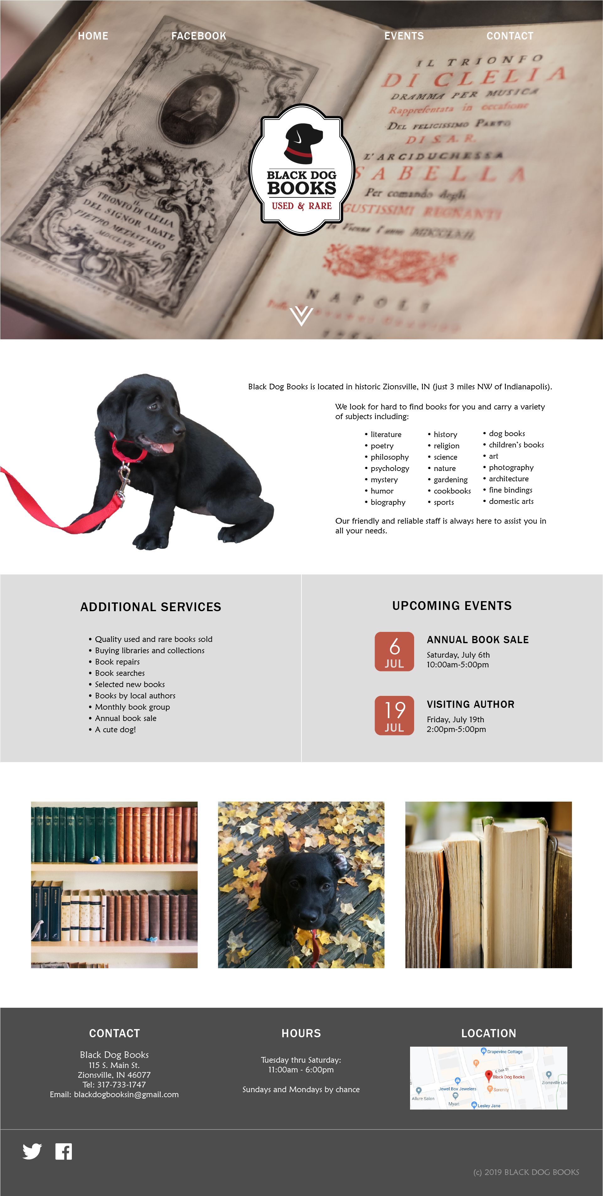 This is an updated look and logo for Black Dog Books, a locally-owned bookstore in Zionsville, IN. The new logo stays true to the original feel with minimal modifications. The website itself uses large photos and a simple layout to lend it a more modern feeling and compartmentalizes the information for easier understanding. This project was made for personal use and is not used by the business.